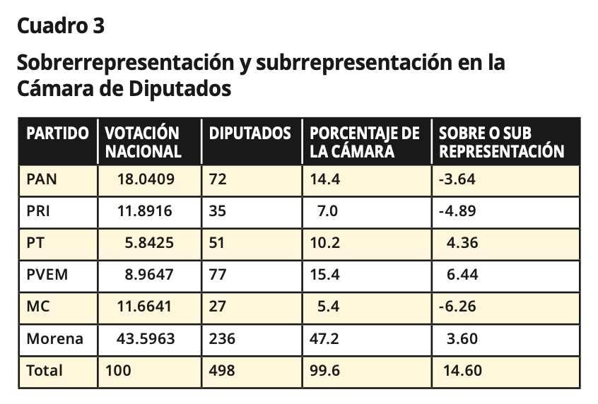 genera la sobrerrepresentación. Para la asignación que realiza el INE de los 200 asientos de representación proporcional se utiliza la votación nacional emitida (ver cuadro 2). Ahora bien, esta votación es muy importante porque es la que se ha utilizado siempre para definir el tamaño de la sobrerrepresentación y no la votación emitida que es la que se recibe en las urnas. Ahora bien, la suma de la votación nacional emitida de los tres partidos que conformaron la coalición Seguimos Haciendo Historia fue de 58.40% y obtuvieron el 72.8% de los asientos en la Cámara de Diputados. En relación con esa votación, la sobrerrepresentación que alcanzan los partidos de la 4 T es de 14.4%, al sumar 3.60% de Morena, 4.36% del Partido del Trabajo y 6.44% del Partido Verde. Por su parte, los partidos opositores tuvieron una subrepresentación de 14.79 al sumar 3.64% del PAN, 4.89% del PRI y 6.26% de Movimiento Ciudadano. Ver el cuadro 3.