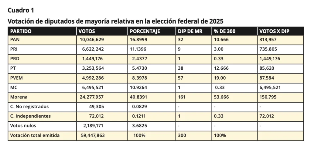 En la elección federal de 2024, de acuerdo con el cuadro 1, los partidos que integraron la coalición Sigamos Haciendo Historia obtuvieron 256 diputaciones de mayoría relativa, mientras la otra coalición, Fuerza por México, integrada por el PAN, el PRI y el PRD, solamente alcanzaron 42 asientos, Movimiento Ciudadano una y hubo un diputado independiente. Como consecuencia de ese resultado, la 4 T obtuvo más del 85% de los asientos de las curules de mayoría relativa y la otra coalición únicamente el 14%. Es obvio que ese resultado provocó una enorme distorsión de la representación política en México, ya que es precisamente en la elección de los 300 distritos uninominales en donde se