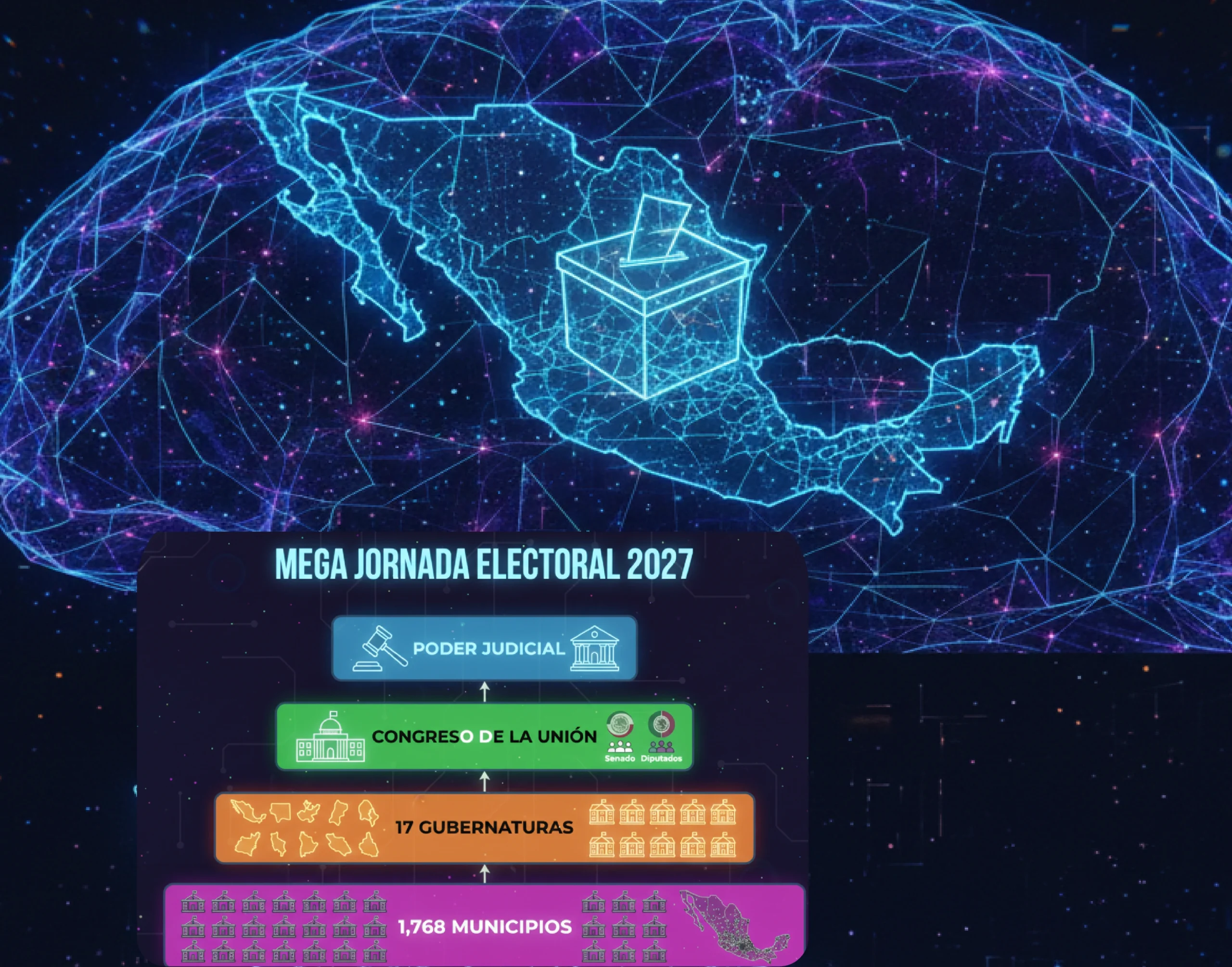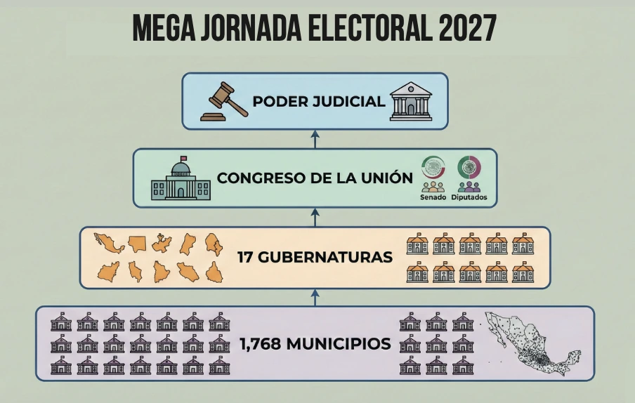 Superada la elección local del 2026, el sistema político mexicano transitará hacia el 6 de junio de 2027, una fecha que marca la mayor convergencia de poder en las urnas de la historia reciente. Este proceso se caracteriza por tres dimensiones de análisis: Reconfiguración de los poderes locales: La magnitud del relevo administrativo es masiva, con la disputa de 17 gubernaturas y la renovación de 1,768 presidencias municipales en 28 entidades. Este fenómeno de simultaneidad implica que casi el 90% de los ayuntamientos del país cambiarán de titularidad.
